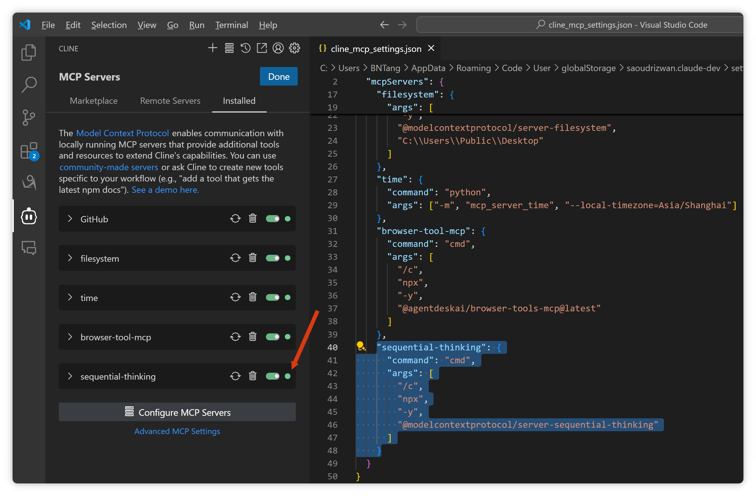 }这样就完成了安装。此时在 Cline 的 MCP Server 选项卡中,sequential-thinking 会变成绿色,表示安装成功: