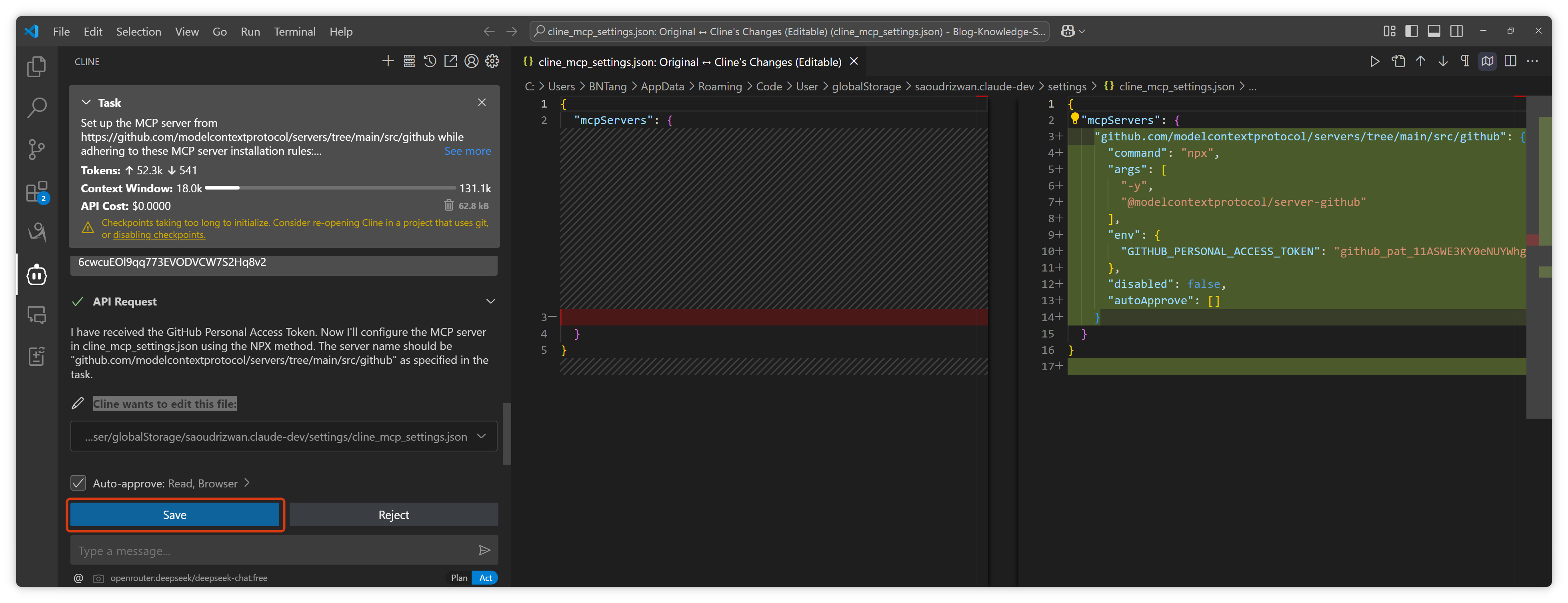 Cline 已经为我们创建好了 配置文件,点击 「Save」按钮 即可保存。