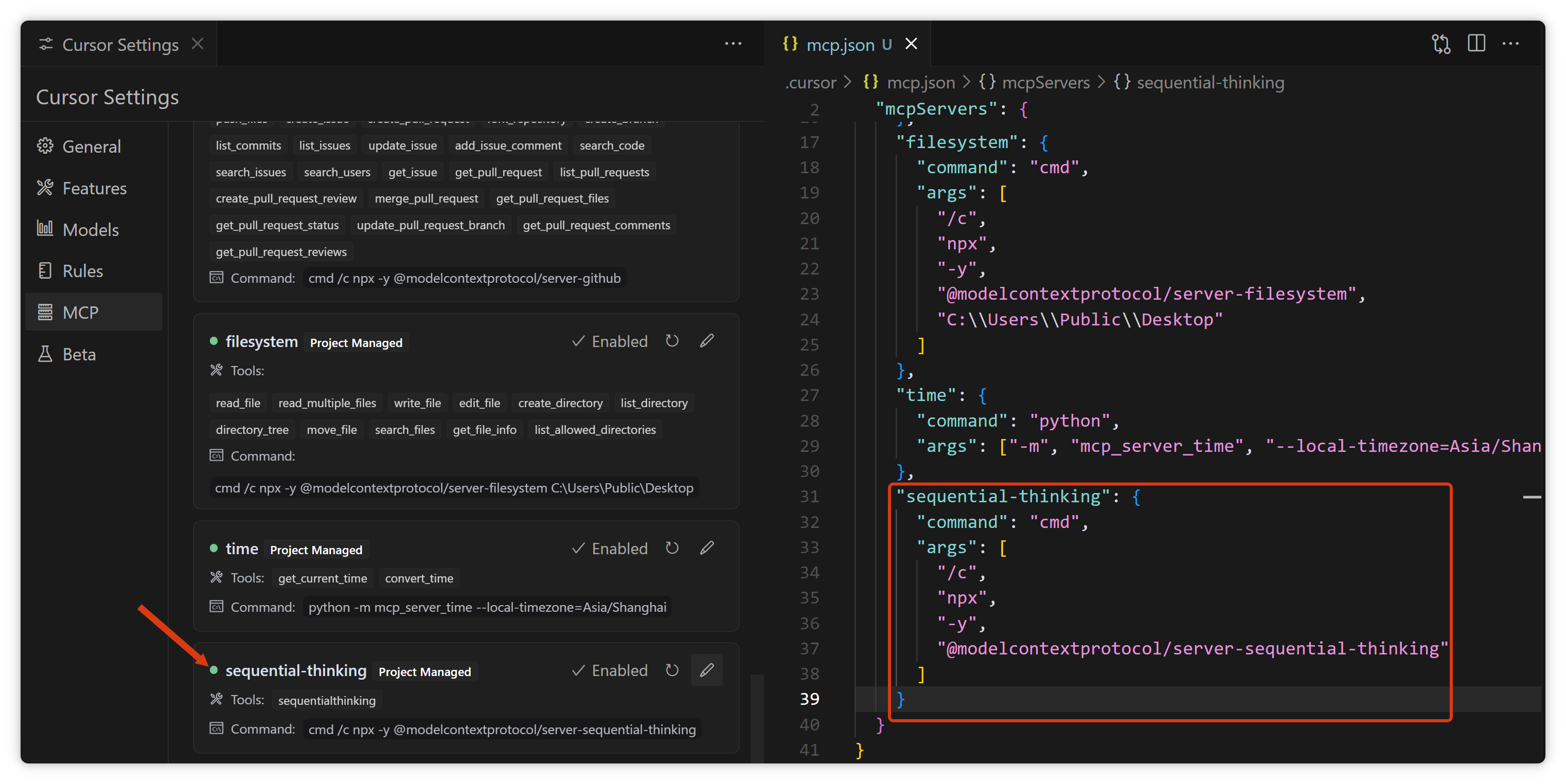 在 Cursor 的 MCP Server 配置中,最后一个 MCP Server 后面添加一个逗号,将配置内容粘贴进去,保存后点击 Refresh 刷新一下,sequential-thinking 同样会变成绿色: