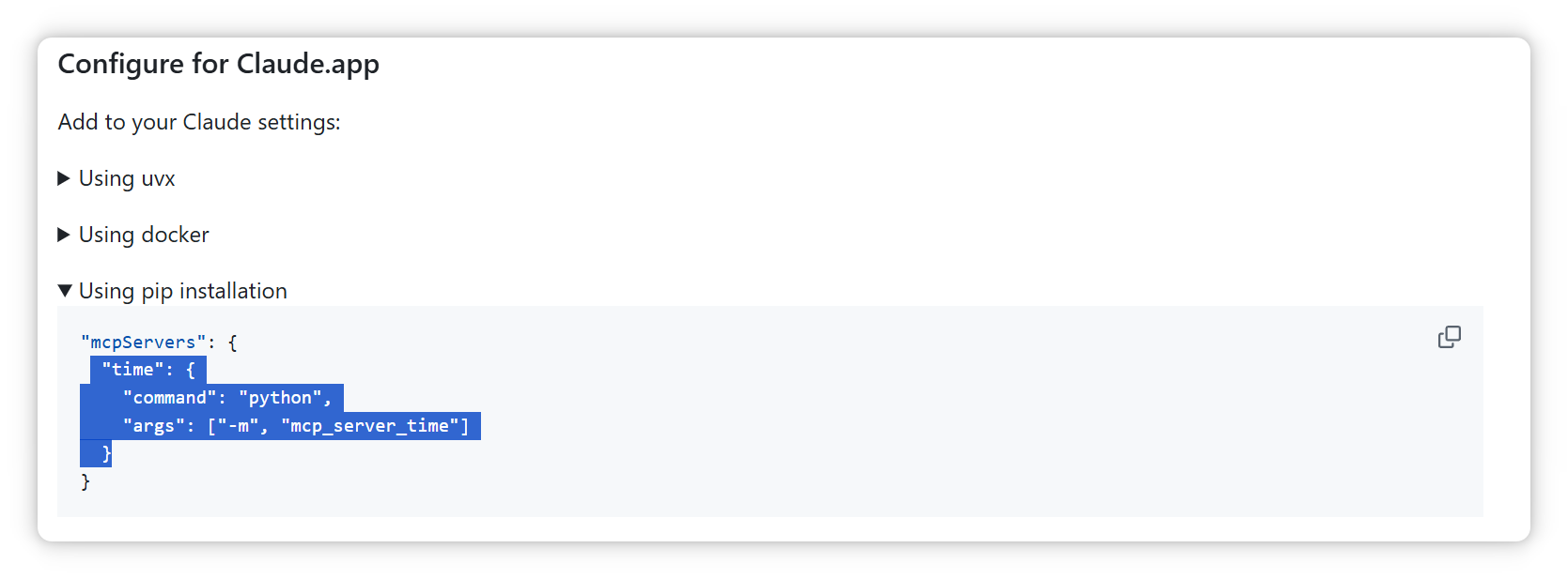 第四步:配置 MCP Server 到 Cline,在 GitHub 页面找到 Configure for Claude.app 部分,展开 Using pip installation,复制以下 JSON 配置: