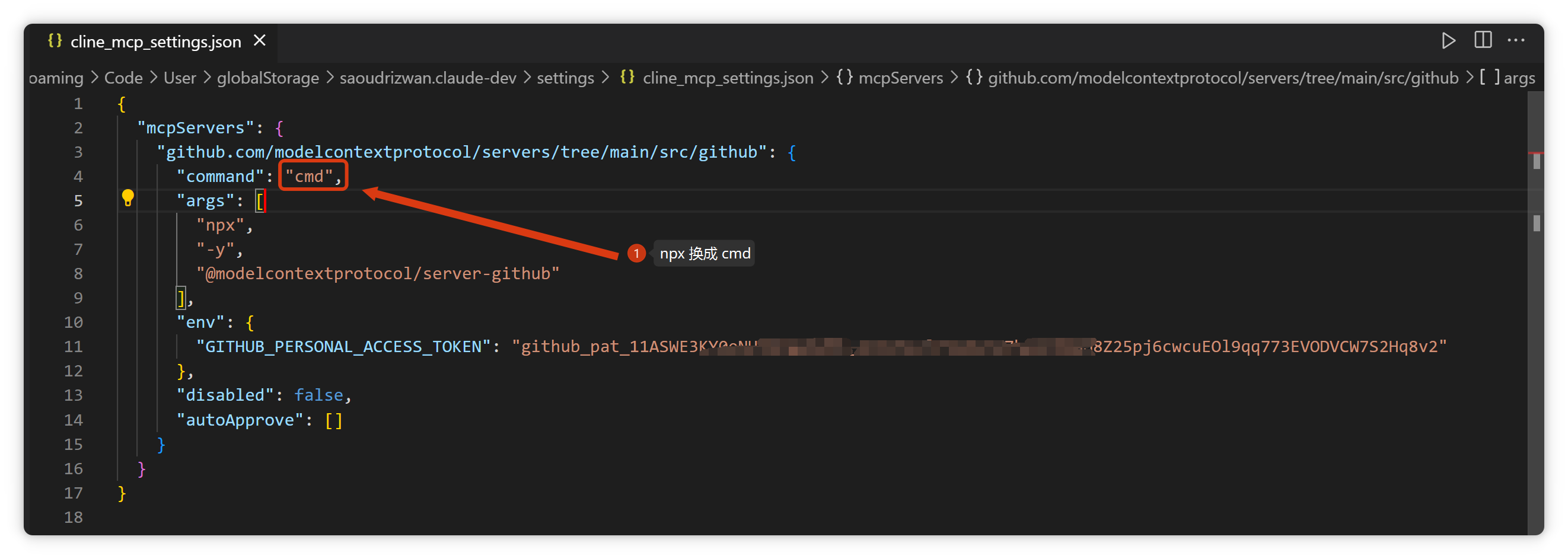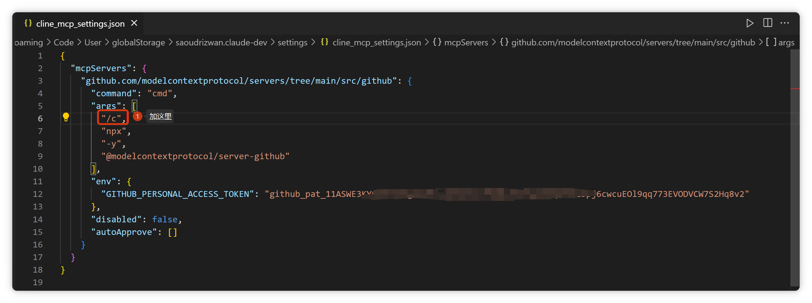 然后回到 Cline 中,在 mcpServers 中添加一个逗号后粘贴刚才复制的内容。如果你使用的是 MacOS,直接粘贴即可;如果你使用的是 Windows,则需要稍作修改:将 npx 移动到 args 中,command 改为 cmd,并在 args 中添加 /c: