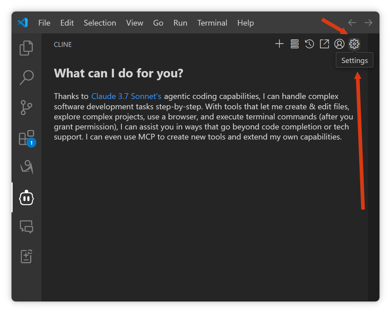 接下来,需要为 Cline 配置一个 AI 模型。首先点击 设置(Settings):