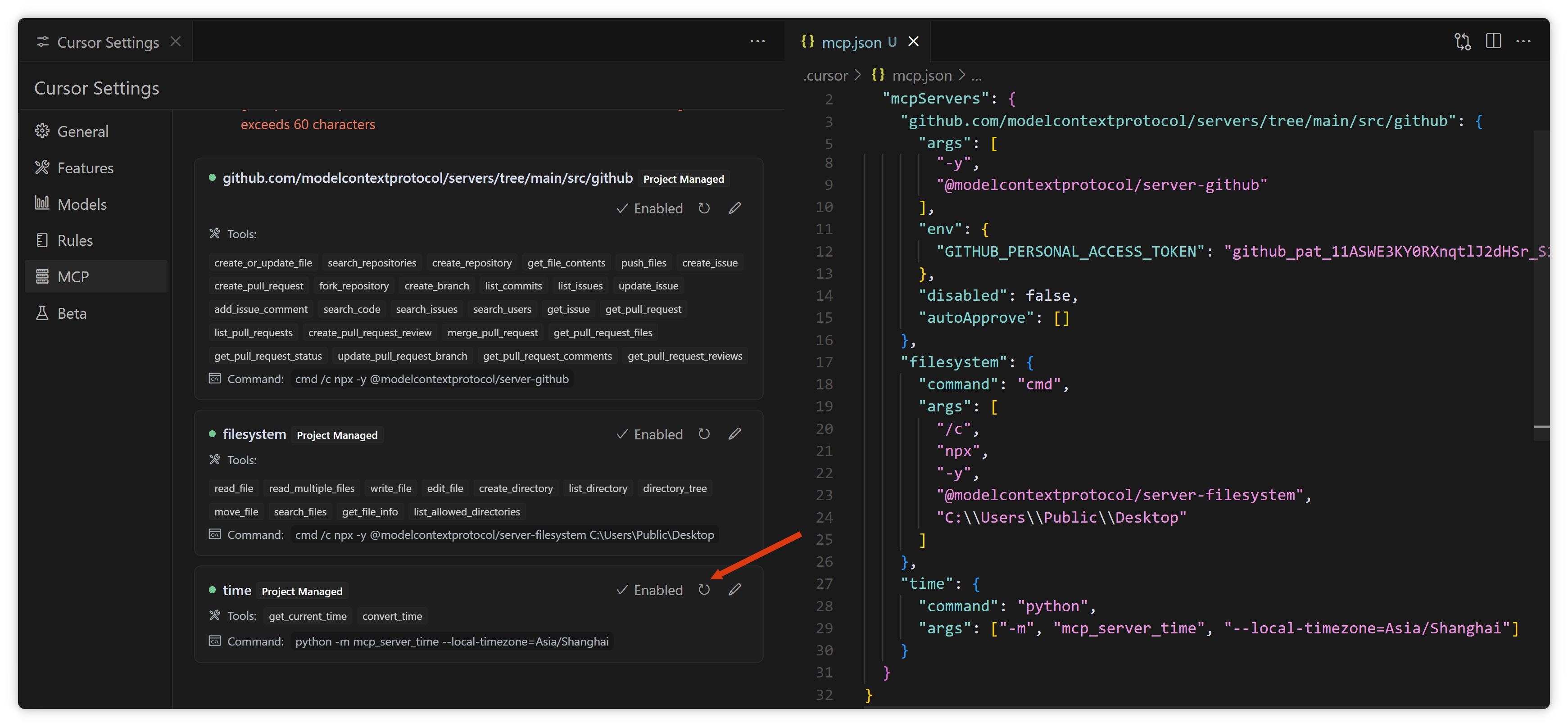 熟练之后,安装一个 MCP 工具只需几秒钟。同样,我们也可以将上述配置文件复制到 Cursor 中,Cursor 也能使用该 MCP Server。