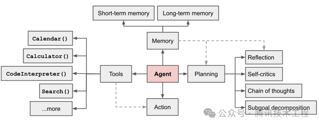 如图 1 所示,在基于 LLM 的智能体中,LLM 的充当着智能体的“大脑”的角色,同时还有 3 个关键部分: