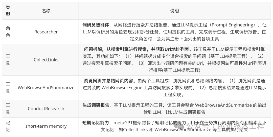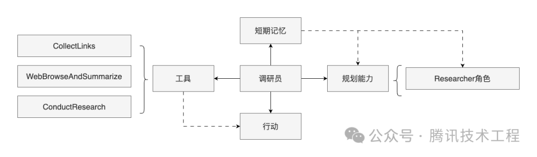回到前文所说的,如果仅有 LLM 这个大脑,是无法完成整个调研流程的。在调研员智能体中,为 LLM 大脑配备了规划、工具、记忆的能力,使得他能独立完成调研任务,下面列出其基本构成,构成分三部分:角色、工具、记忆。在角色中,会注册各种工具,定义思考规划的方式,以及本身具备的短期记忆能力。