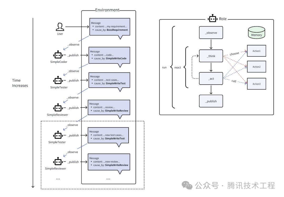 上文曾使用到MetaGPT ,MetaGPT 是一个多智能体框架,多智能体框架可以帮你开发一个由多个不同职责的智能体组合起来的多智能体。举个例子,如果我们想开发一个多智能体软件团队,该软件团队可以根据用户需求交付代码,其内部会通过测试代码、评审代码来提升代码质量。该多智能体将包含:开发(coder)、测试(tester)、评审人(reviewer)这三个不同职责的智能体,他们各司其职,互相协作完成任务。下图的左侧是多智能体的协作流程,右侧是单智能体的工作流程。