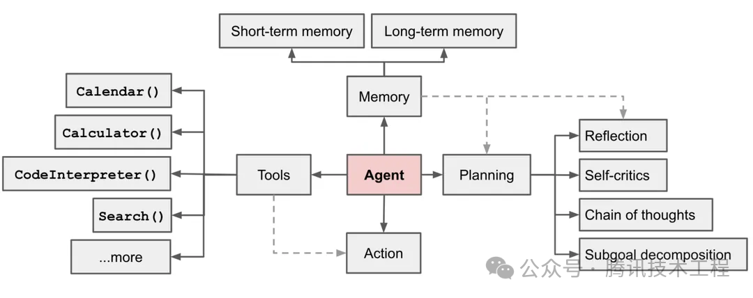 智能体 如上图所示,在基于 LLM 的智能体中,LLM 的充当着智能体的“大脑”的角色,同时还有 3 个关键部分:规划(Planning)、记忆(Memory)、工具使用(Tool use)