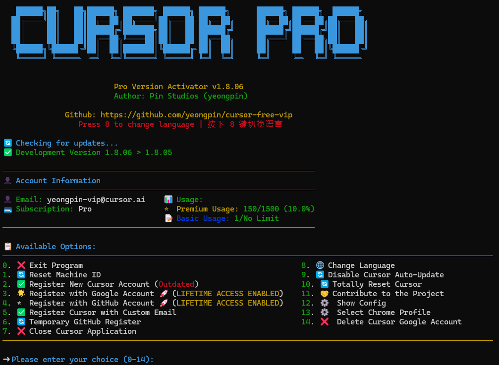 cursor-free-vip | 全平台 | 自动注册/硬件重置/Pro功能解锁 | 周更 |