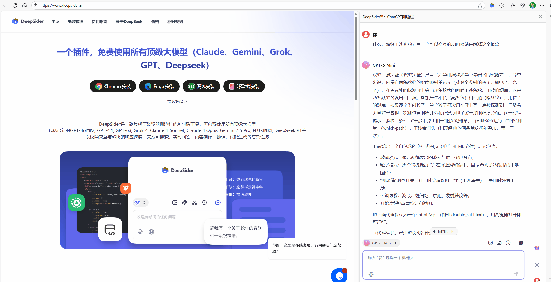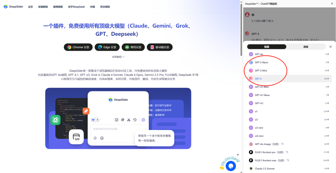 但现在我们可以通过这款浏览器插件,DeepSider——直接使用目前市面上最热门的几十款AI大模型,包括GPT-5全系列!