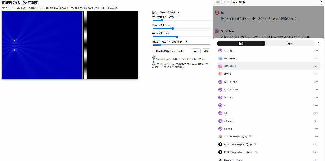 以下图为例,使用DeepSider中的GPT-5 Mini生成双缝干涉实验互动网站代码:
