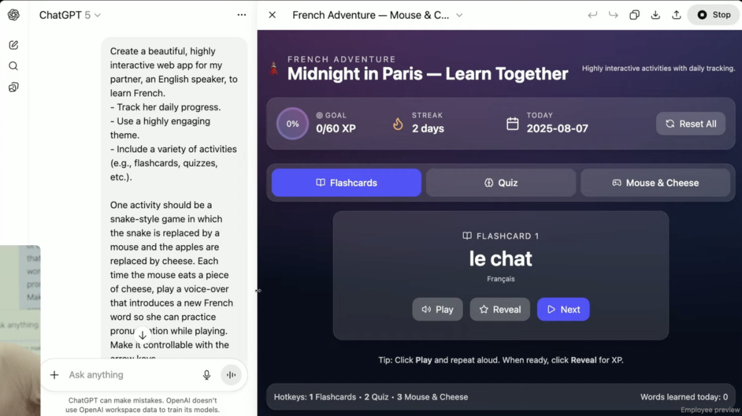 比如让它“做一个能学法语的网页”,3分钟不到,GPT-5就拿出了一个极其完整的可用网页。