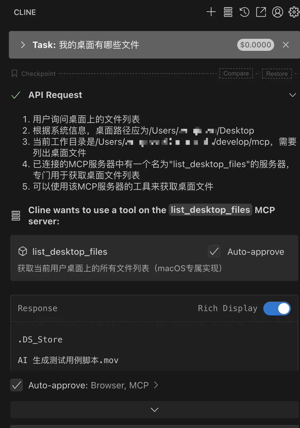 pip install mcpmcp version应返回版本号(如1.5.0)。支持MCP的客户端(如Cline、Cursor、Claude Desktop)用于测试,或使用调试工具如MCP Inspector。