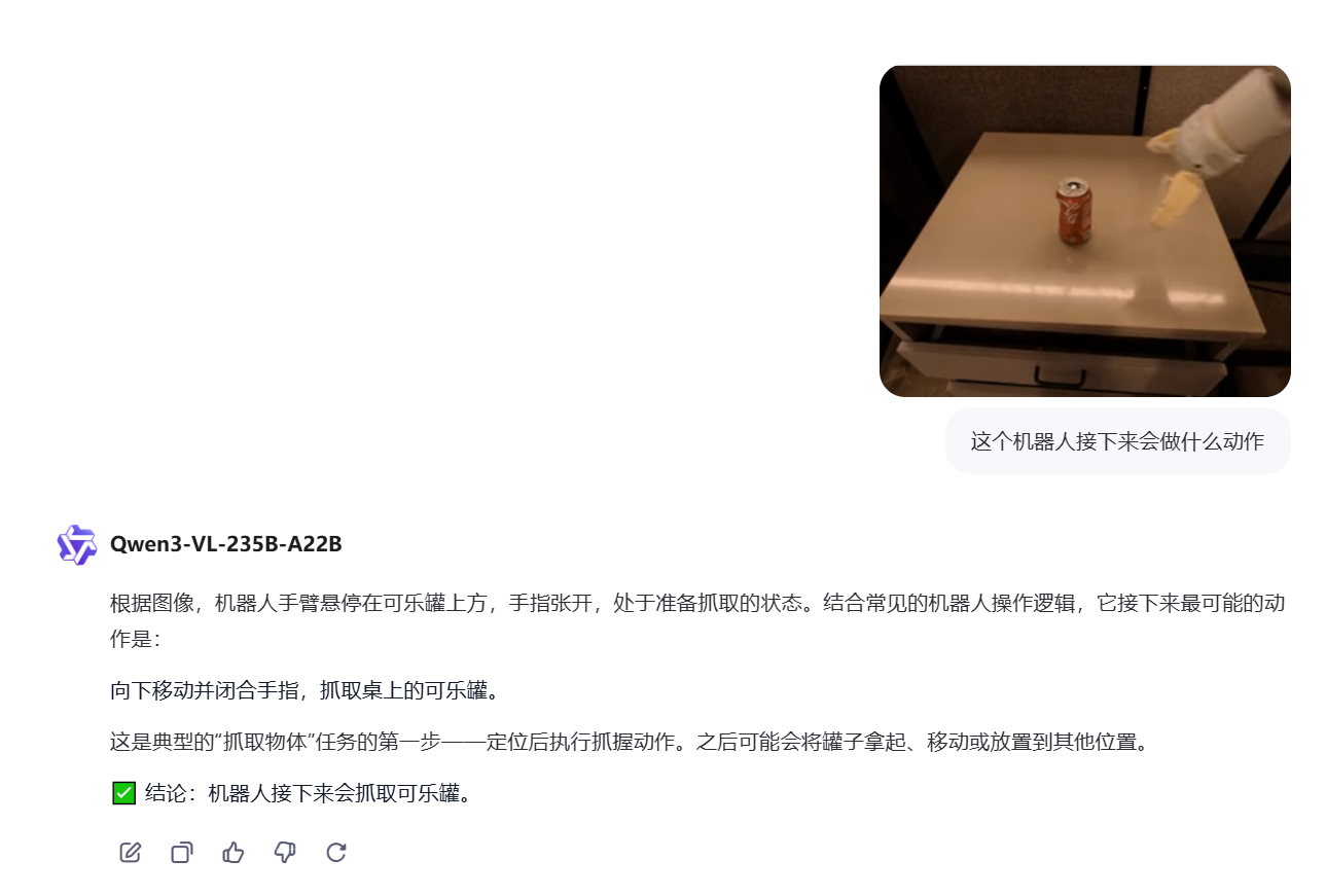因此我给了一张图:桌上有一个可乐,让它预测接下来机器人的动作,可以发现它其实很容易就推理出来了。