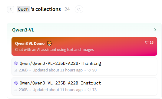 在开源网站Huggingface中,Qwen3-VL提供了两种版本,一个是Instruct版本,另一个是推理增强版本Thinking版本。目前整体参数量级在235B之后,应该之后会再开源一些蒸馏小版本提供给更多用户进行部署。