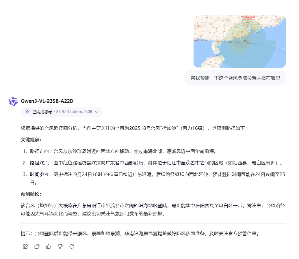 从它的回答上看,模型认为:图中红色路径线最终指向广东省中西部沿海,具体位于阳江市至茂名市之间的区域(如阳西县、电白区附近)