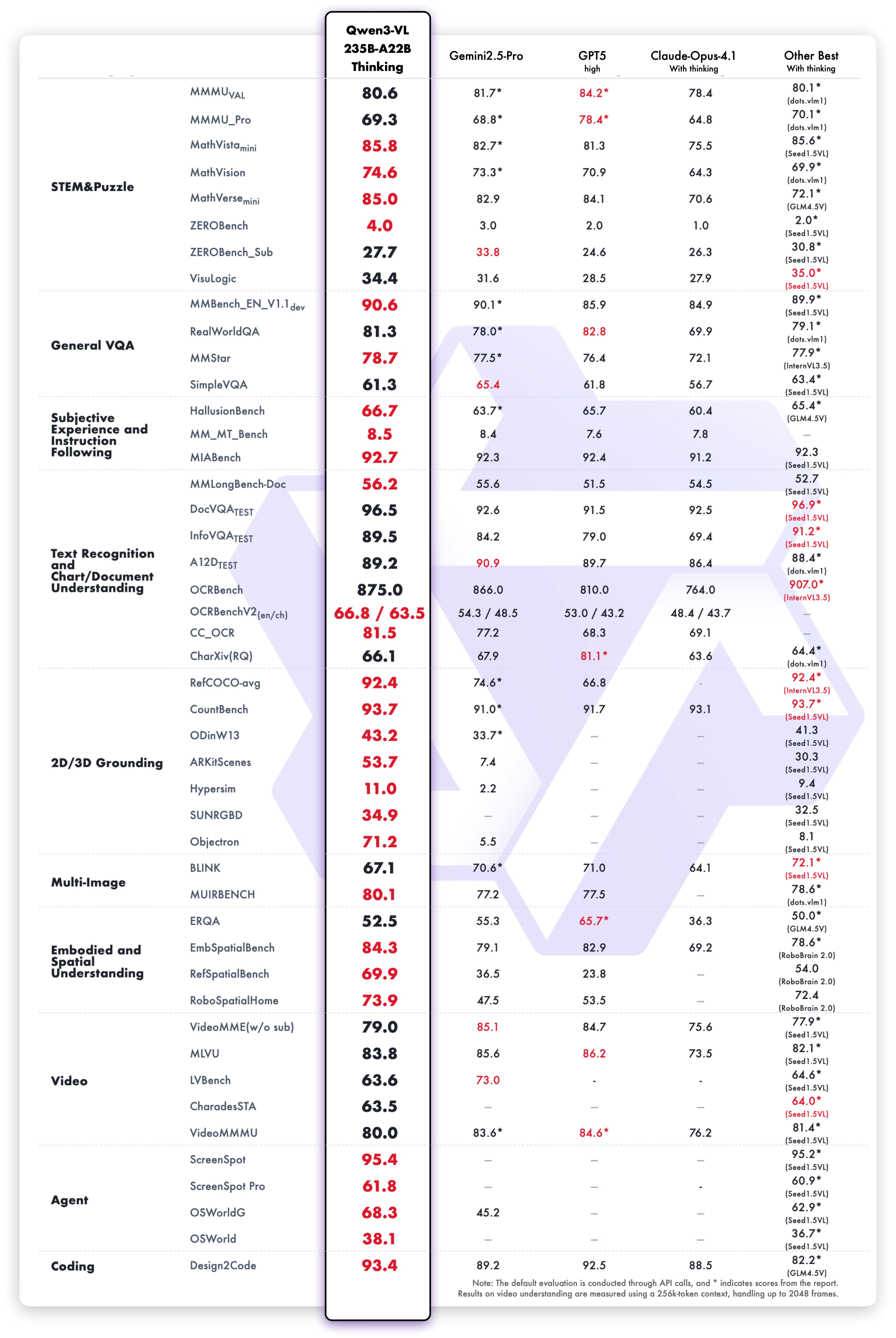 而在推理方面,Qwen3-VL-235B-A22B-Thinking 同样在多数指标上创下开源多模态模型的新高,与 Gemini 2.5 Pro 和 GPT-5 等闭源顶尖模型相比各有胜负。尤其在 Mathvision 这类复杂的多模态数学题目上,其表现甚至优于 Gemini 2.5 Pro。虽然在多学科问题、视觉推理和视频理解方面与闭源 SOTA 模型仍存在一定差距,但在 Agent 能力、文档理解、2D/3D Grounding等任务上展现出明显优势。