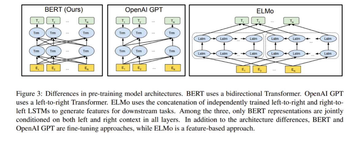 BERT使用双向Transformer,OpenAI GPT使用从左到右的Transformer,而ELMo则使用独立训练的从左到右和从右到左的LSTM的拼接来为下游任务生成特征。在这三种模型中,只有BERT的表示在所有层中都同时依赖于左右上下文。