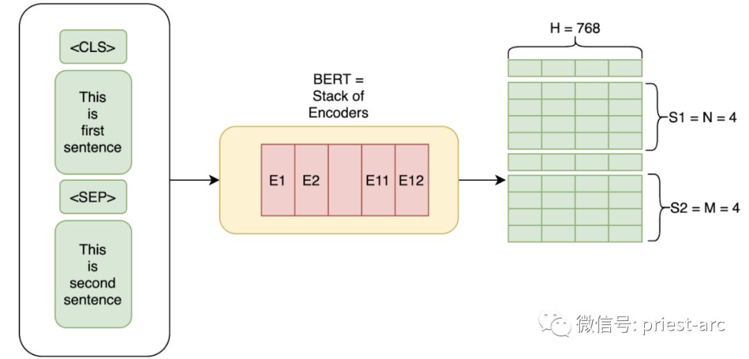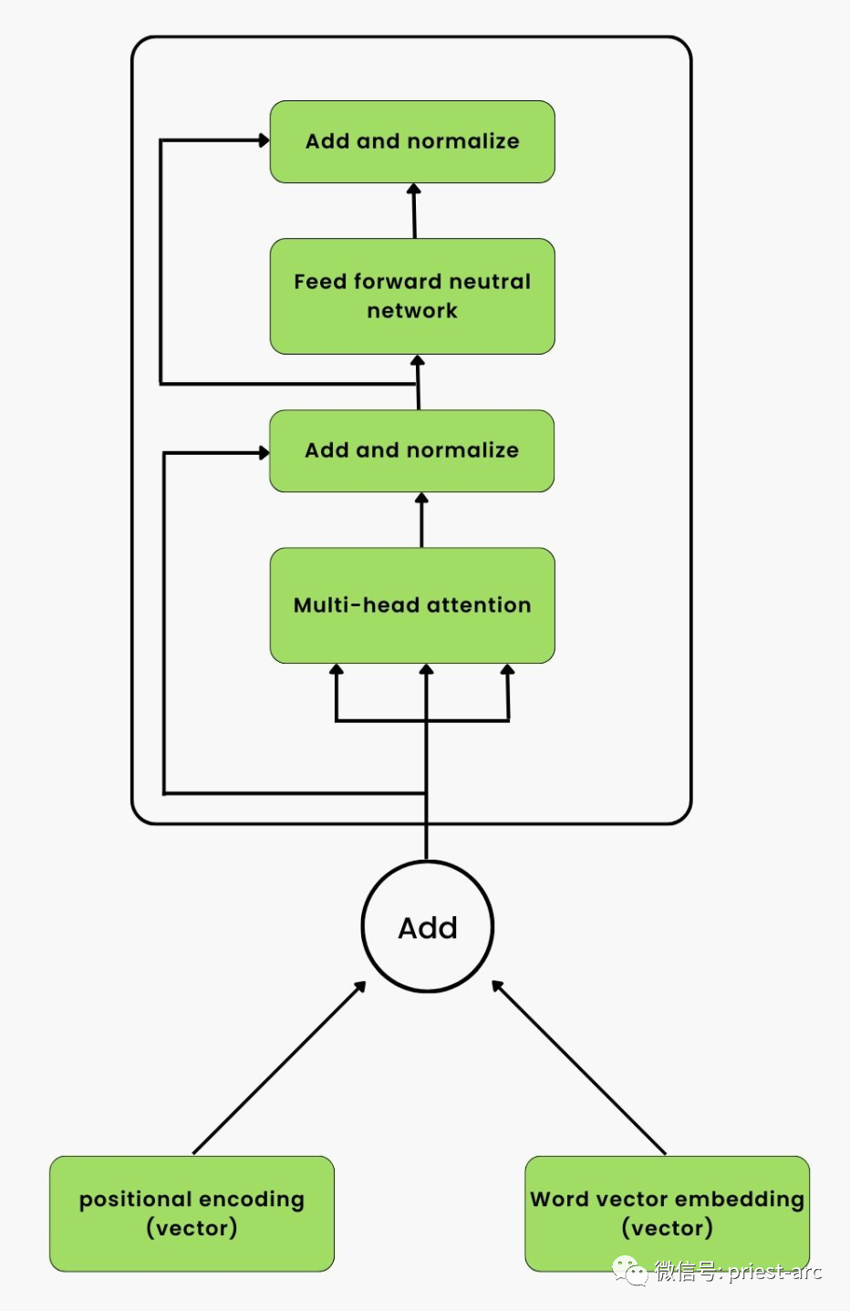 位置编码器将原始文本中单词的位置表示为向量。Transformer 将词向量嵌入和位置编码结合起来。然后,它将组合结果发送到各个编码器,然后是解码器。