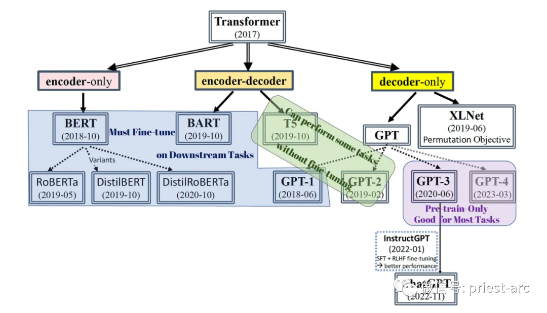 当然,除了上面的 2 个核心模型外,T5、BART 和 XLNet 也是 Transformer(Vaswani 等人,2017)家族的成员。这些模型利用 Transformer 的编码器、解码器或两者来进行语言理解或文本生成。由于篇幅原因,暂不在本篇博文中赘述。