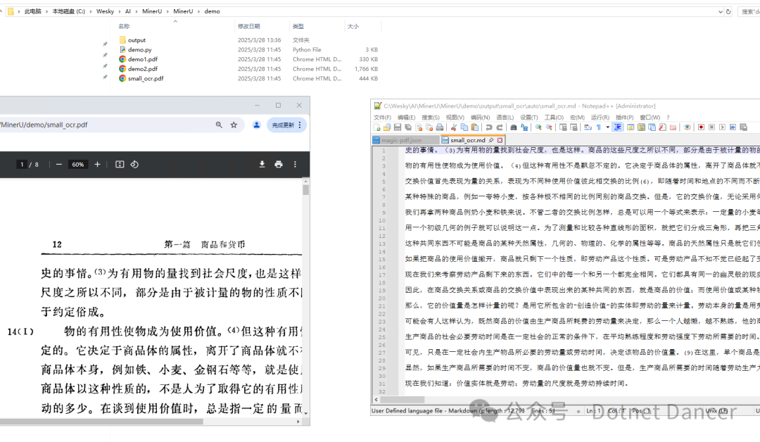 执行以后,可以看到输出了md文件,以及其他一些杂项。打开MD文件和原始的PDF文件数据进行比对看效果,初步看起来识别是成功的。