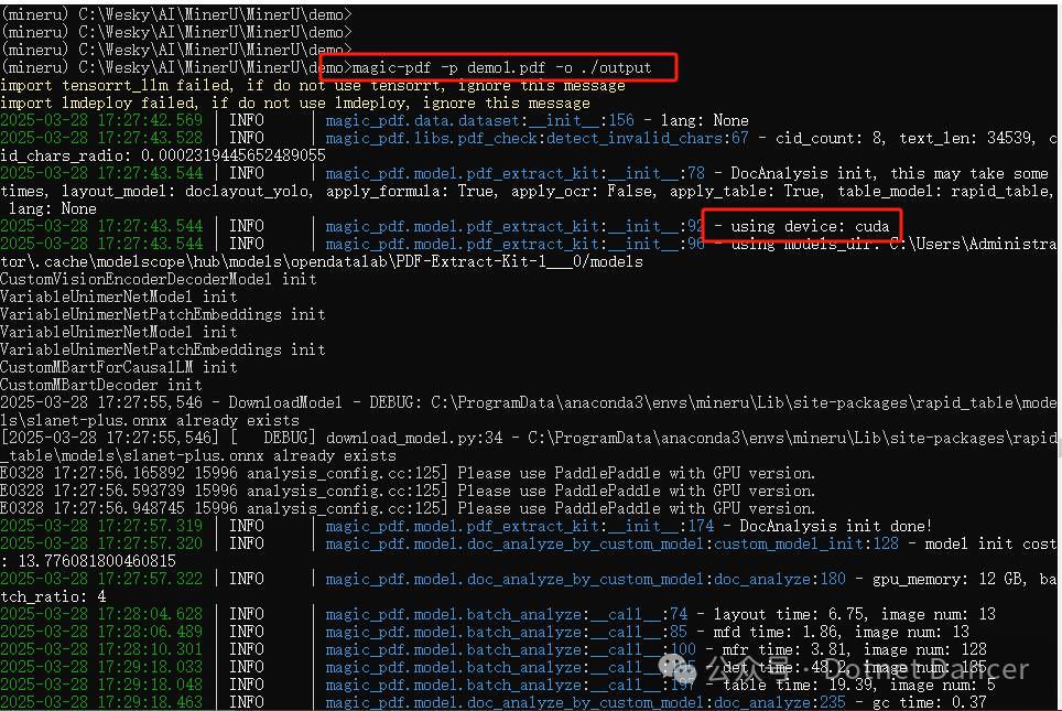 修改完毕,直接运行,这次换一个带有图片的demo1.pdf,执行期间也可以看到输出日志,选择了cuda(显卡资源)来执行。