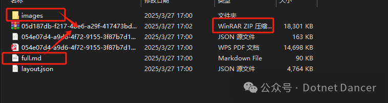 解析成功以后,本地会有输出的解析目录,如下所示。假如你用MaxKB的情况下,需要把images和full.md一起打包成zip压缩包丢给它。