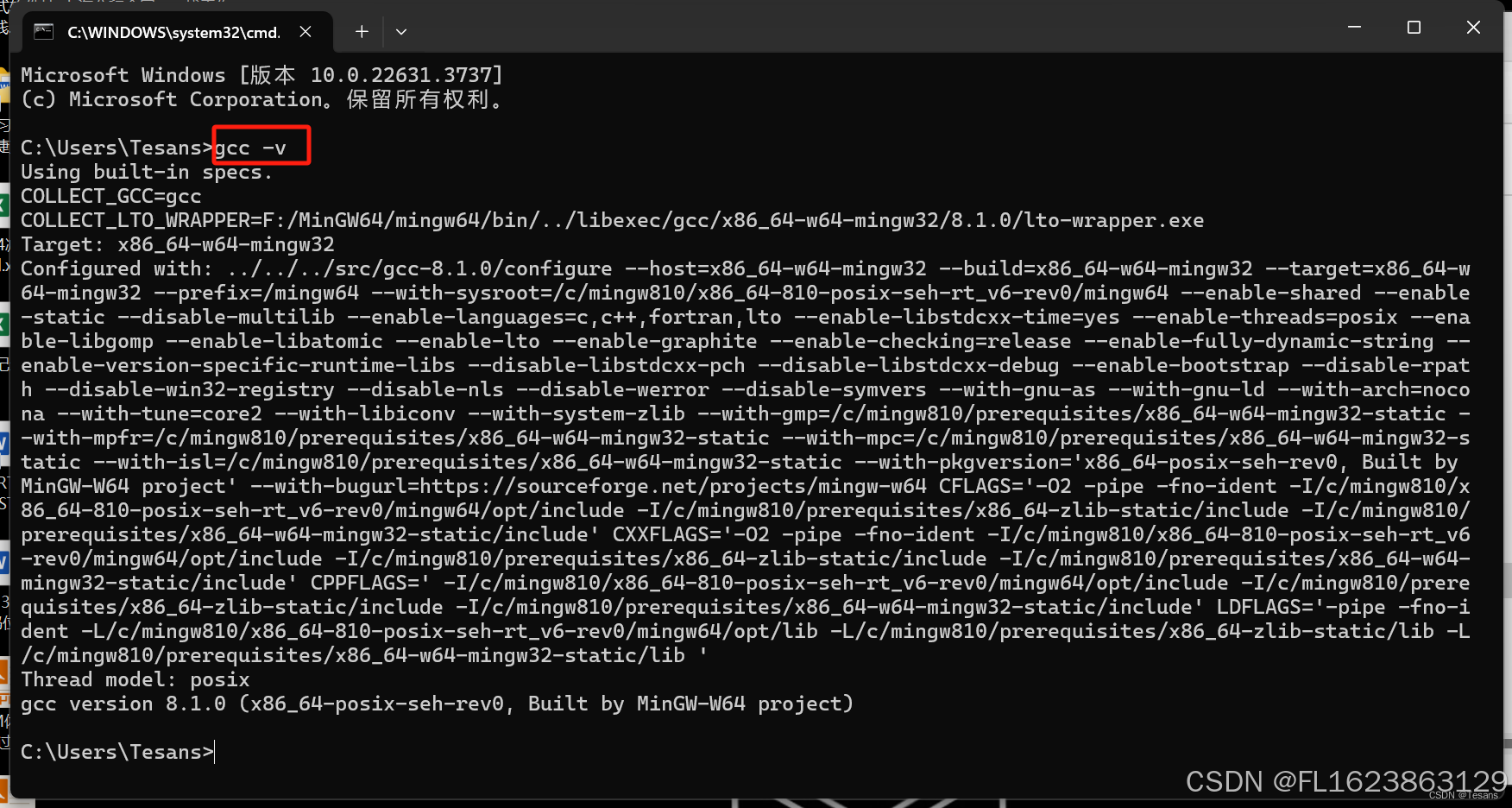 Win+R打开命令提示符窗口,输入gcc -v按下回车,如果显示下面的界面,就说明配置成功了,即MinGW安装成功。