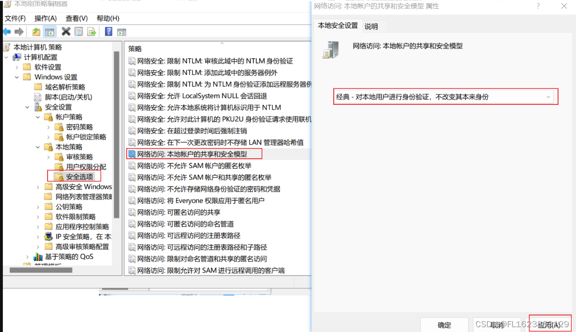 (4) 【本地策略】-【安全策略】-【网络访问:本地账户的共享和安全模型】设为"经典-对本地用户进行身份验证,不改变其本来身份"