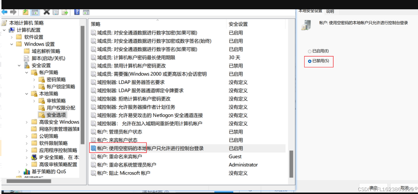 (3) 【本地策略】-【安全策略】-【账户:使用空密码的本地账户只允许通过控制台登录】改为"禁止"