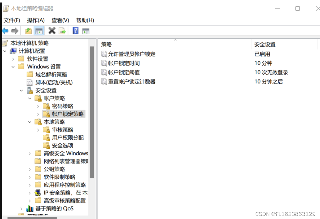 (2)打开”本地策略“【计算机配置】-【Windows设置】-【账号锁定策略】-"账号锁定阈值",修改为"0"次无效登录
