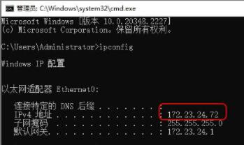 2、在黑色的命令窗口输入 ipconfig 按Enter/回车键执行命令即可查看到IP地址。