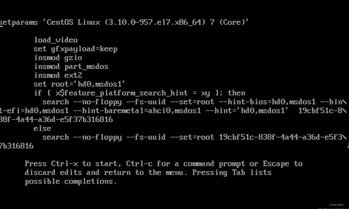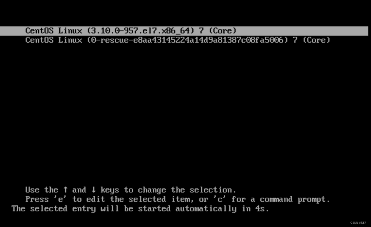 重启系统,在开机过程中,出现以下界面时按e键,进入编辑界面。