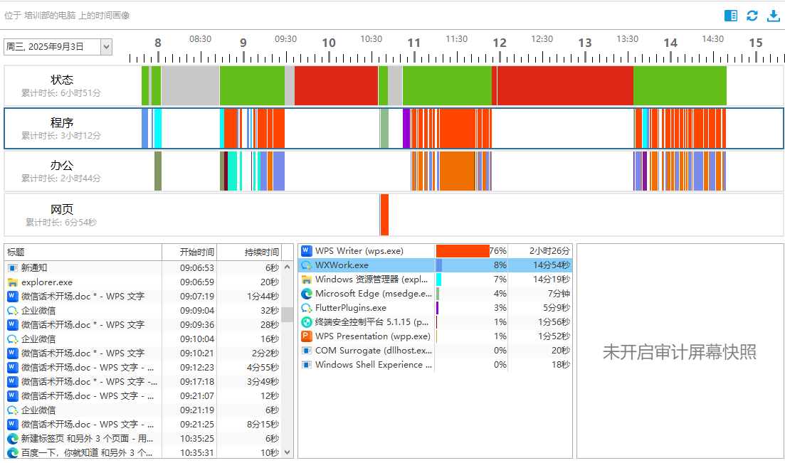 2.程序使用监控日志:实时记录运行程序名称、使用时长及频率,通过时间分布分析员工工作习惯,辅助优化任务分配,提升整体效率。