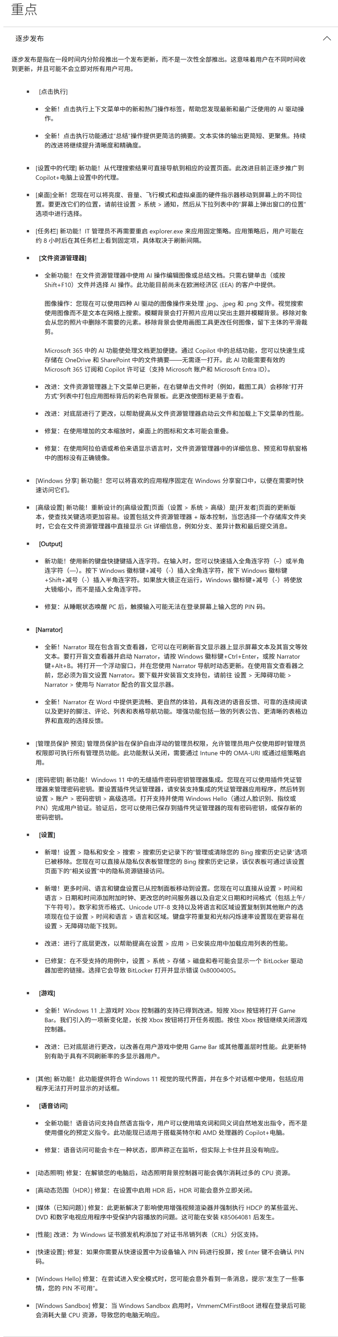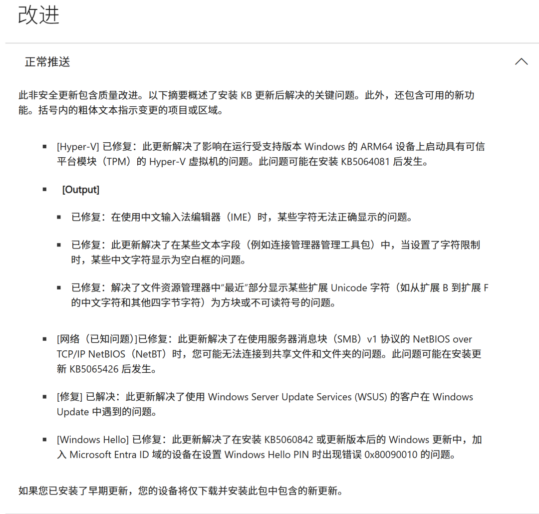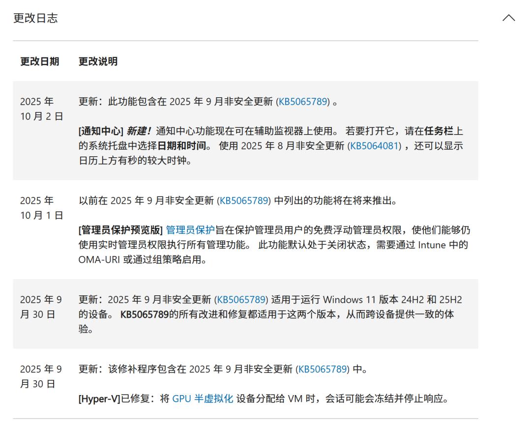版本更新说明,目前24H2和25H2版本,更新内容基本一致。只不过新功能和改进,会优先在25H2系统上生效