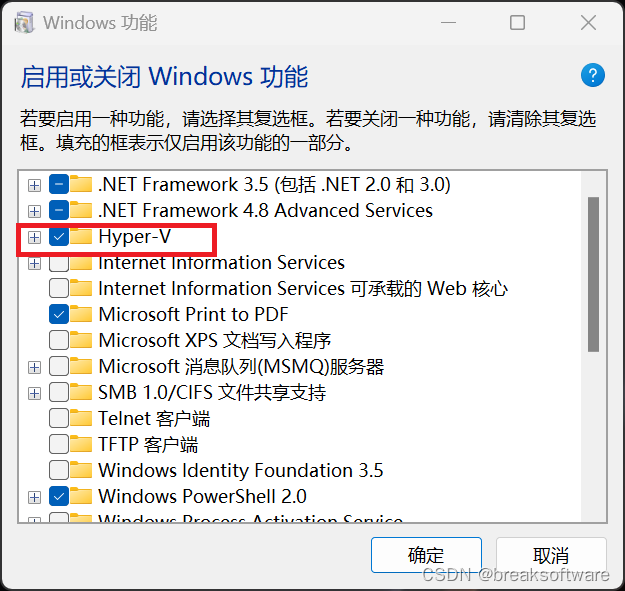 重启电脑后进入“启用或关闭Windows功能”,勾选Hyper-V。然后点击“确定”,待准备好后,重启系统。