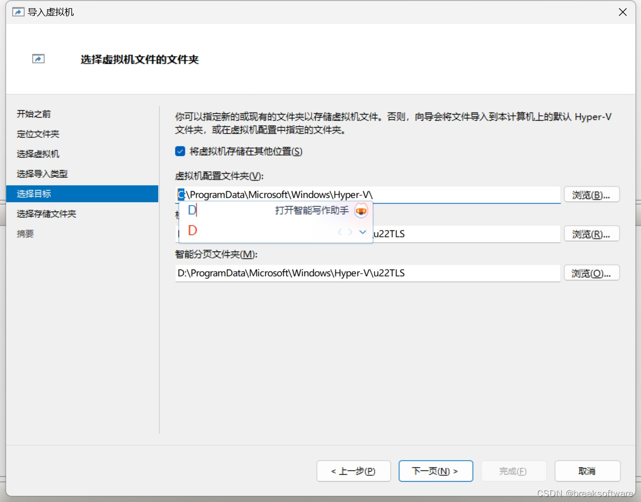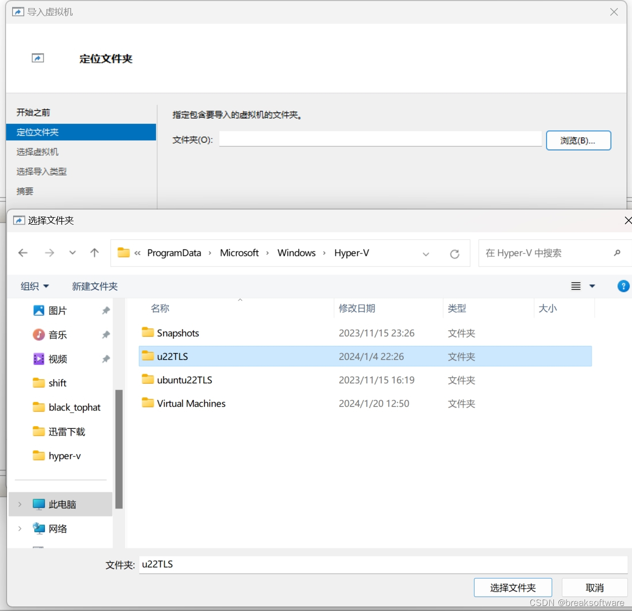 注意选择虚拟机的文件夹,这儿选择到Hyper-V目录下一级即可,不可以多也不可以少。