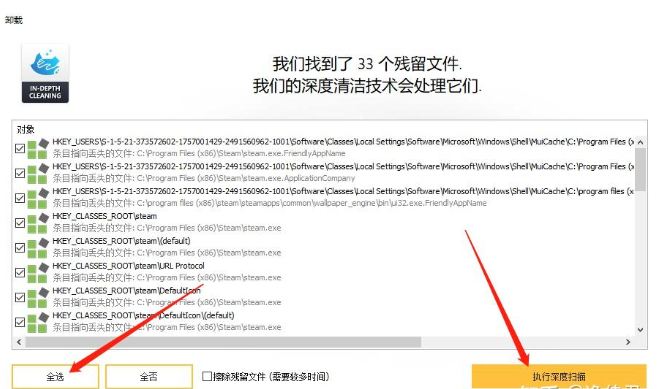 第二次会深度扫描注册表以及残余文件,将其全选勾上执行深度清理。到这一步才算彻底卸载干净。