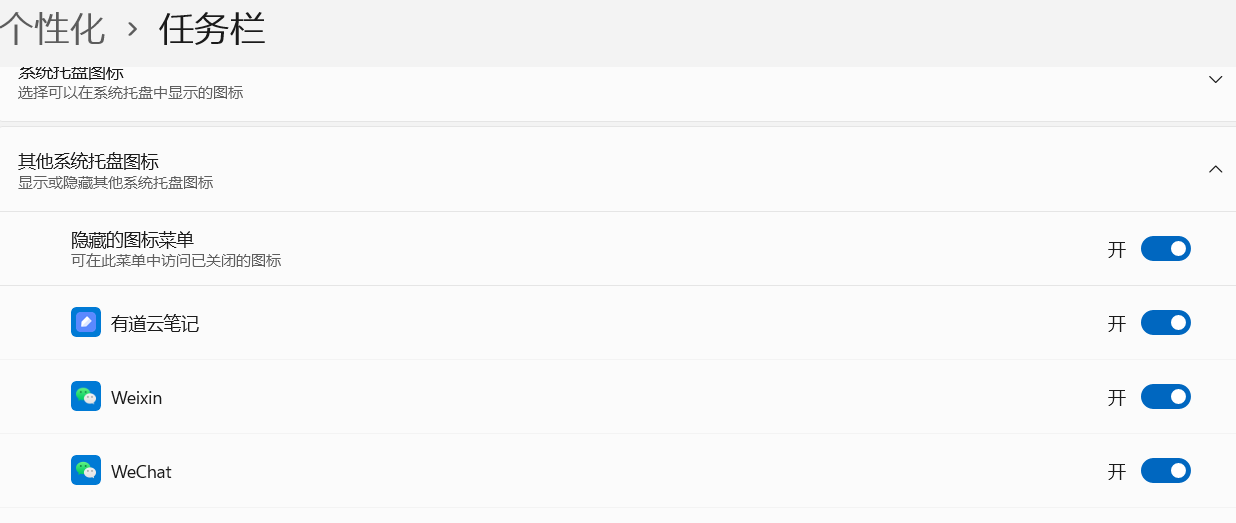 鼠标放至桌面任务栏右侧,右击“任务栏设置”,进入“个性化>任务栏”,中部点击“其他系统托盘图标”,展开即可以每个软件图标隐藏和打开的状态,点击需要打开或隐藏的图标就可以了。