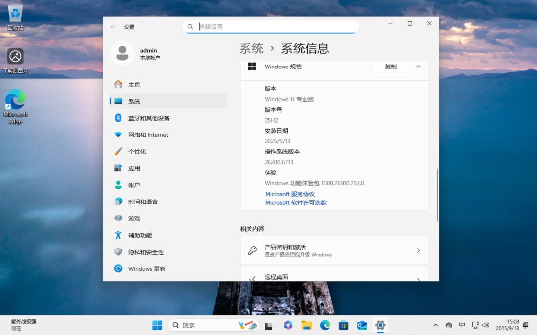 安装后系统信息如图,版本号 26200.6713 (25H2)