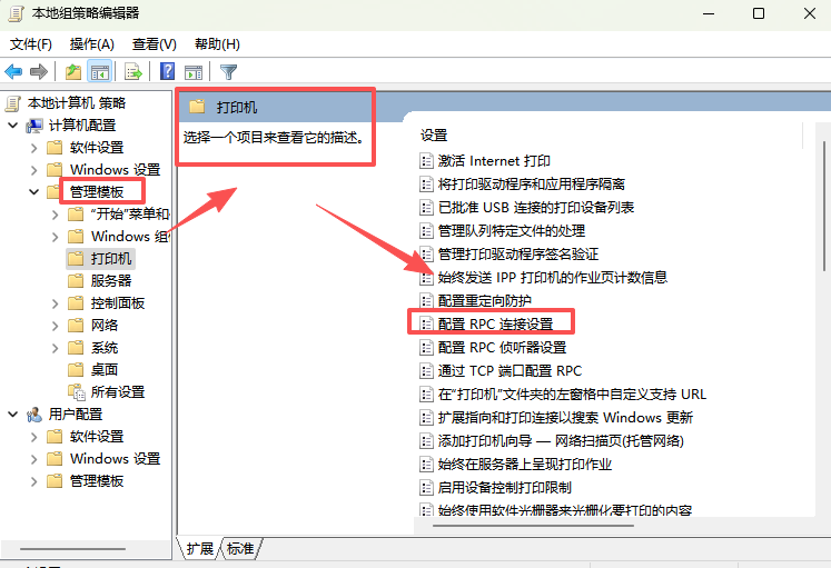 按下组合键【Win+R】输入‘gpedit.msc’,打开本地组策略编辑器;依次展开 “计算机配置→管理模板→打印机”,双击 “配置 RPC 连接设置”;