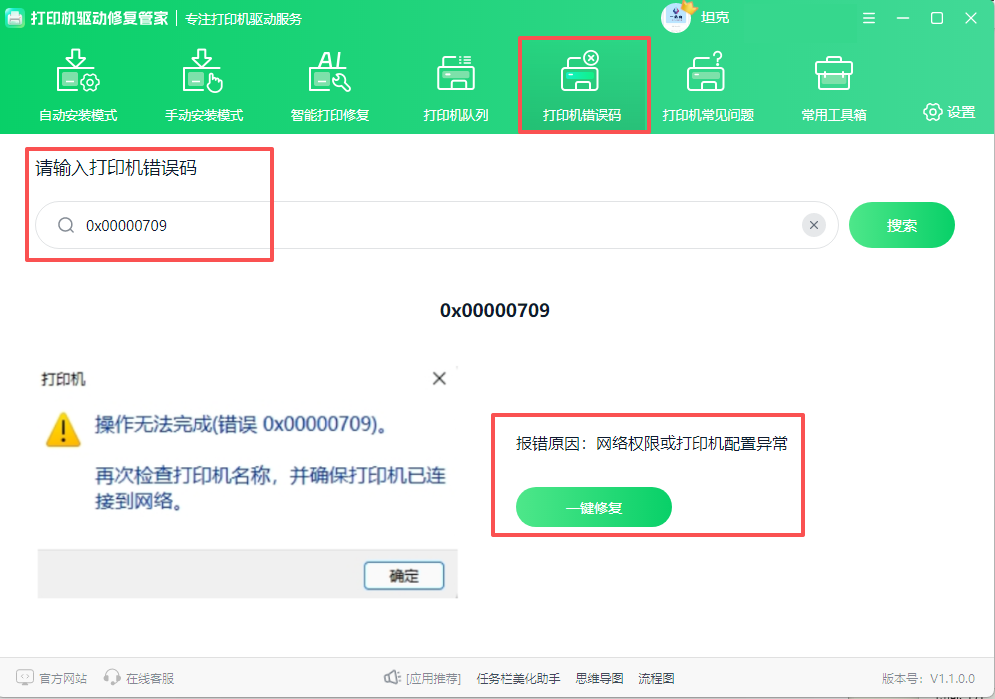 还可以输入打印机错误码,搜索报错原因以及解决方式、点击【一键修复】按钮就能修复打印码错误的问题!