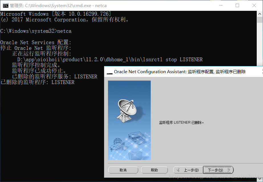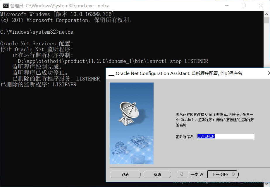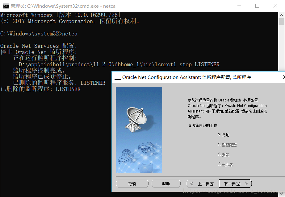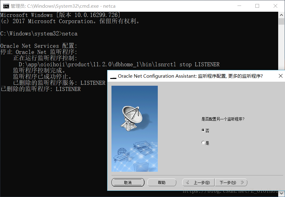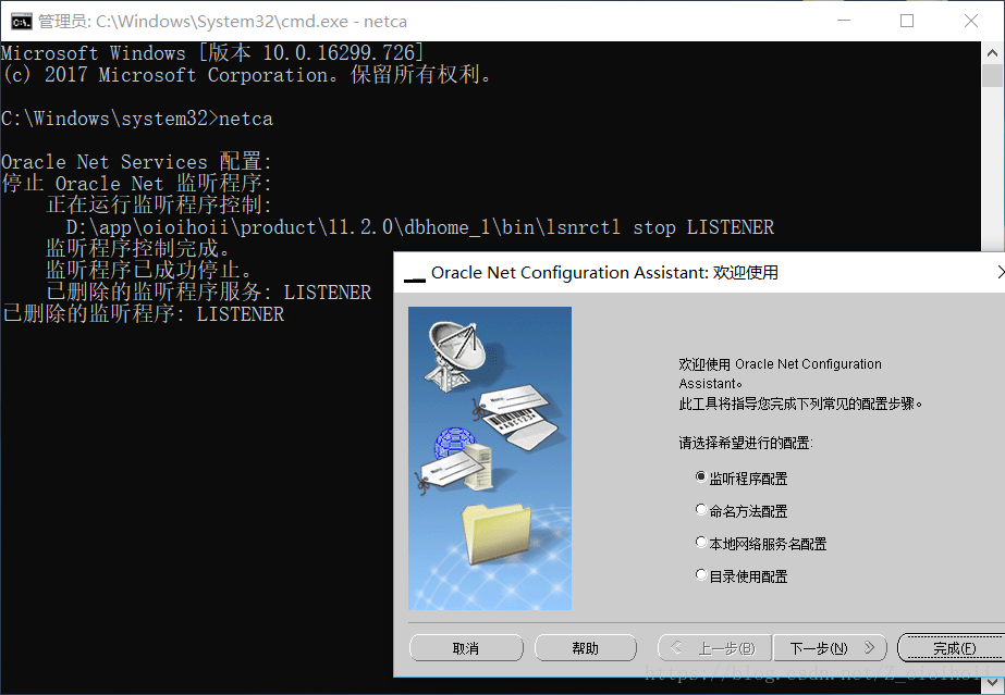 这个监听程序真的不是一般的难打开,这个安装数据库时默认会打开相应的服务在win10上,如果打不开,则要通过Oracle自带的工具重新删除/新建配置来打开它!一定要注意,以下的cmd窗口是用管理员身份运行的,如果是正常的cmd窗口,配置多次仍然打不开监听程序,无法解决问题!