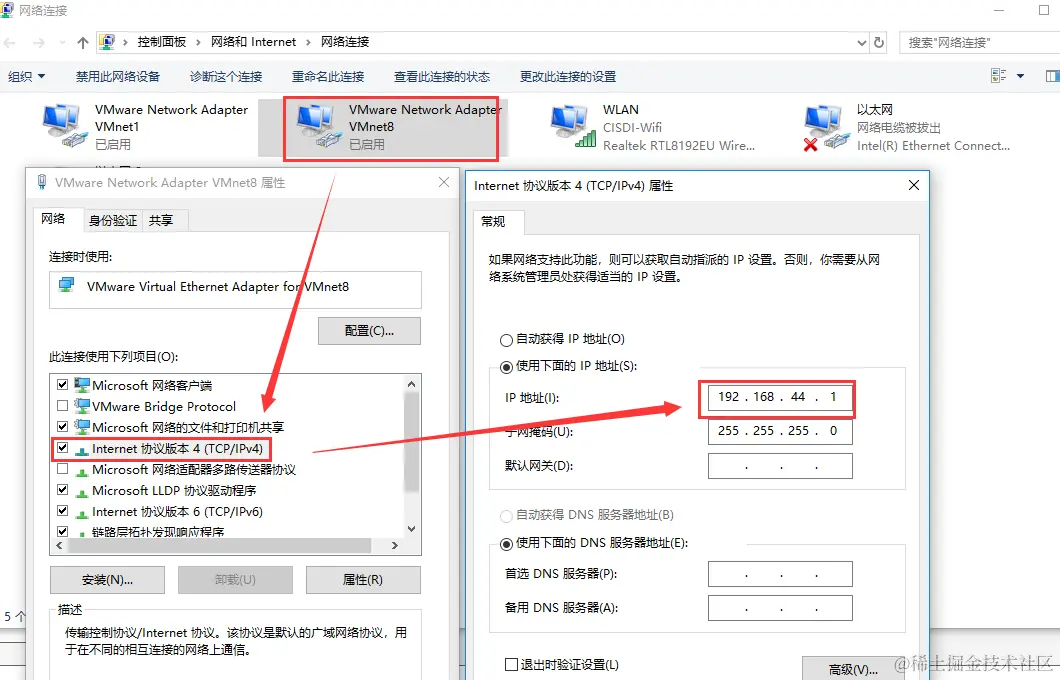 注:上图中192.168.44.2为网关地址,192.168.44.255为广播地址,192.168.44.0一般为网段IP,所以0,2,255这三个地址不能设置。