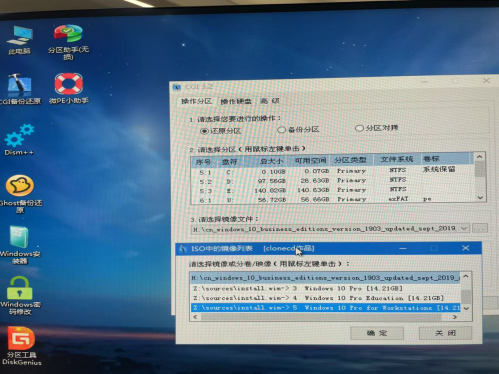 5.版本选择:Windows 10专业工作站版 然后选择优盘中的系统镜像,因为这是全镜像,所以包含多版本镜像,选择了镜像后,会弹出ISO镜像列表,这次安装选择Windows10 Pro Workstation(win10工作站版)。