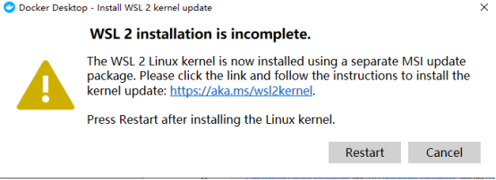 问题描述:WSL 2 installation is incomplete. The WSL 2 Linux kernel is now installed using a separate MSl updatepackage. Please click the link and follow the instructions to install thekernel update: https://aka.ms/wsl2kernel. Press Restart after installing the Linux kernel.