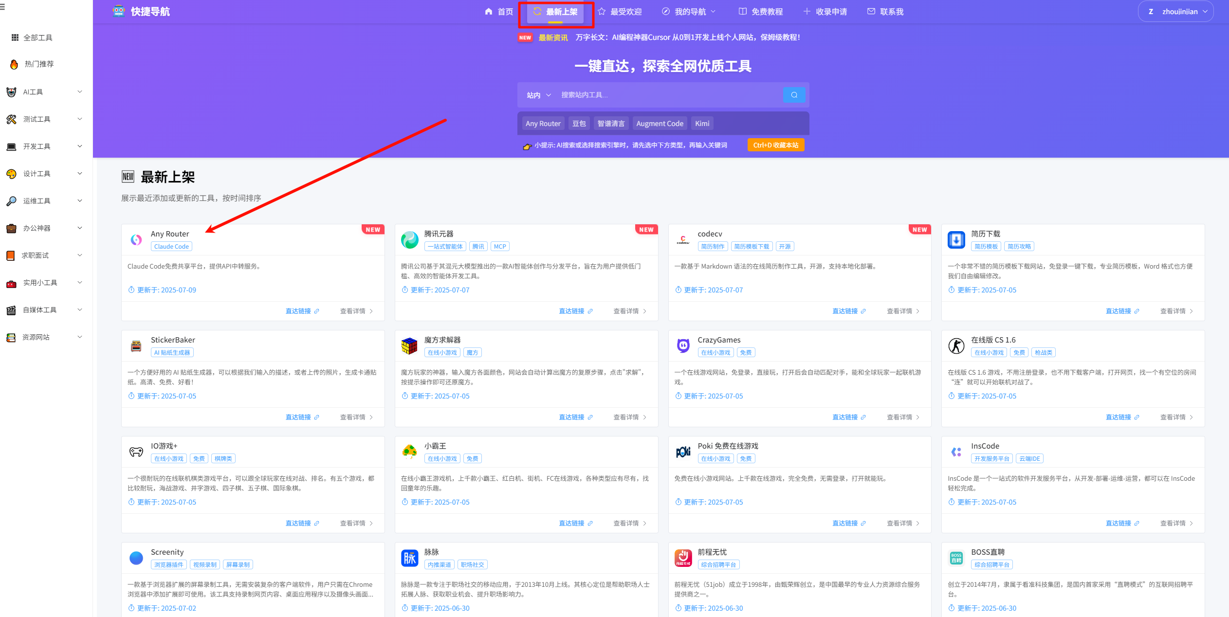 打开快捷导航平台(https://kjdaohang.com/),点击最新上架菜单,找到Any Router,点击直达链接。
