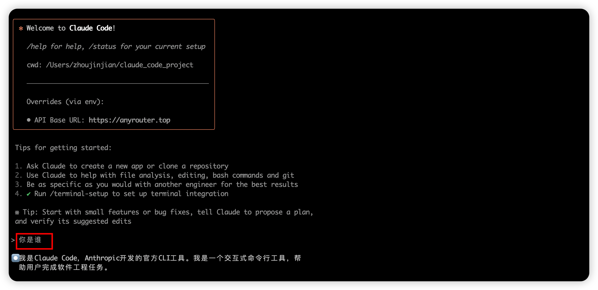 echo -e '\n export ANTHROPIC_BASE_URL=https://anyrouter.top' >> ~/.zshrc9、步骤9: 使用 Claude Code