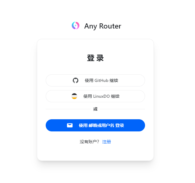 2、步骤2: 进入到Any Router首页,使用 GitHub 账号登录(如果没有 GitHub,需先注册一个,此处需要魔法)