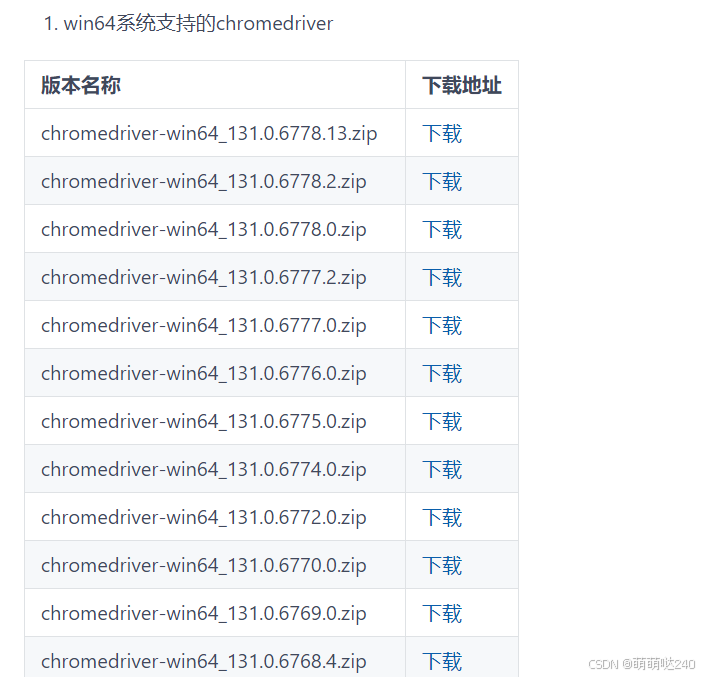 - 访问ChromeDriver的下载页面blog.csdn.net/FL1623863129/article/details/139712067。该页面提供了ChromeDriver的稳定版本下载链接。如需最新版本可以去镜像地址gitee.com/FIRC/chromedriver_mirror,里面包含了windows,macOS和linux各个版本chromedriver