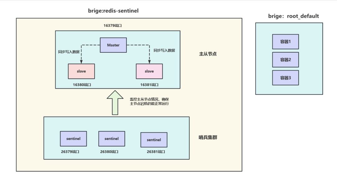 所以我们这里就希望创建一个名为redis-sentinel的bridge网络将主从和哨兵节点关联起来,并且和docker中的其他容器隔离开:
